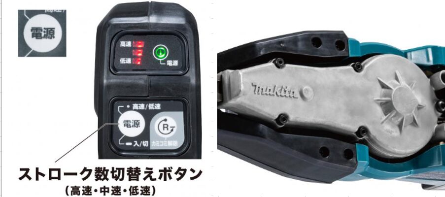 マキタ 18V 片刃仕様ヘッジトリマ「MUH503SD」「MUH603SD」「MUH753SD」は、造園・植木職人などプロユーザーが現場で使う片刃ヘッジトリマの市場を、エンジン式から充電式へ移行させることを目的として開発された機械です。