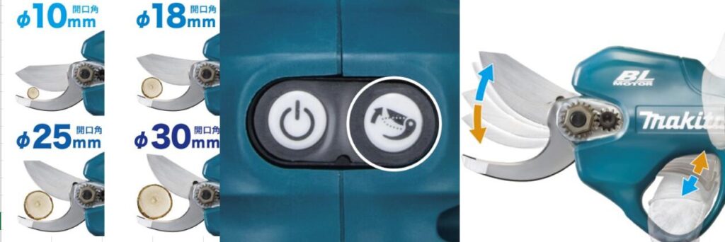 ①枝の太さに合わせて、開口角を4段階切替
