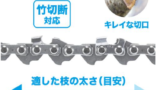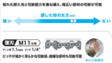 M11は刃先が小型で、アサリが小さく、切断溝が狭いため、ハンディーソーのようにチェーンスピードが遅いモデルではとくに跳ねが少なく感じます。果樹園などの作業においてファーストタッチでの良好な切削間を求めるユーザーにはM11がおすすめです