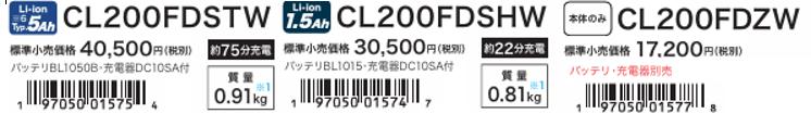 ①CL200FDSTW(5.0Ahバッテリと充電器)