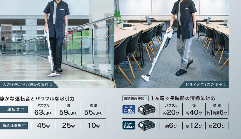 『軽くて驚くほど静か』というコンセプト通り、1.5Ah装着時0.81kg、5.0Ah装着時でも0.91kgと軽量になっています。また騒音値63(dB(A))でありながら従来の18V製品同等のパワフルな吸引力を実現しており、女性の方やご年配の方に特におすすめの掃除機となっています。