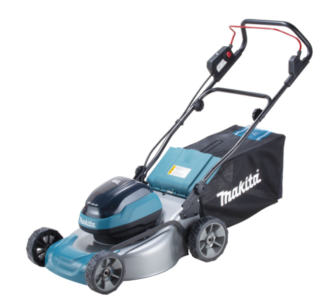 マキタの36V(18V×2)充電式芝刈機 MLM466D。旧モデルMLM460Dから大幅に進化した改良モデルで、刃物前方傾斜構造・刃物回転の加速性向上電気ブレーキの3つの新機能を搭載することで操作荷重を約80%軽減しました。