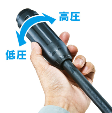 手元で高圧<>低圧、圧力調整。網戸やエアコン室外機も優しく洗浄可能。