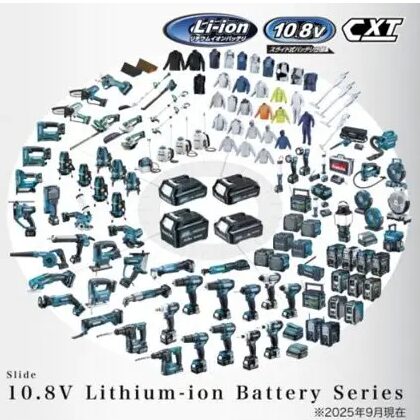 10.8Vシリーズはテレビやラジオ、インパクトドライバ、ジグソー、草刈機、スマートフォン充電、空気入れなど、100モデル以上の機種と互換性があります。