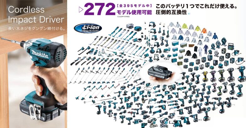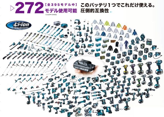 バッテリを1度購入すれば実に272モデルの製品に使用することができます。本体のみ(バッテリー・充電器別売)の販売もあるため、毎回セット品を購入しなければならないということもありません。