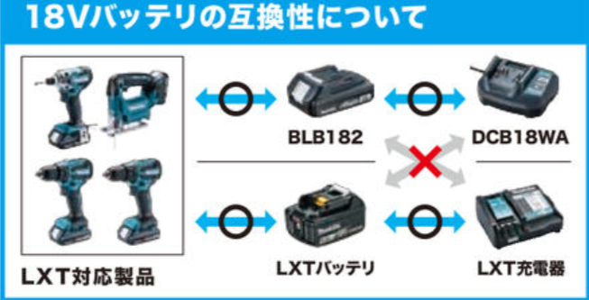 図のようにTD156DBに付属しているバッテリーBLB182はDCB18WAの充電器しか使用できません。また従来より販売しているLXTバッテリー(BL1830B/BL1840/BL1850B/BL1860B)をお持ちの場合は、機械本体には使用できますがDCB18Wで充電することはできません。