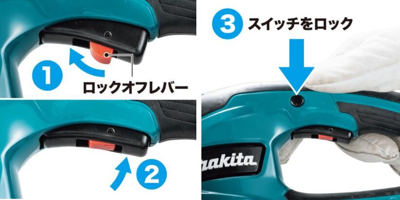 ③ロックオンスイッチを押すと、スイッチレバーを引いた状態を保持します。