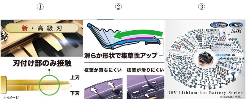 ③『MUH016G』は『MUH308D』をベースにパワー・ストローク数をアップし、刈込感を向上、40Vmaxユーザー・造園などハードユーザー向け。