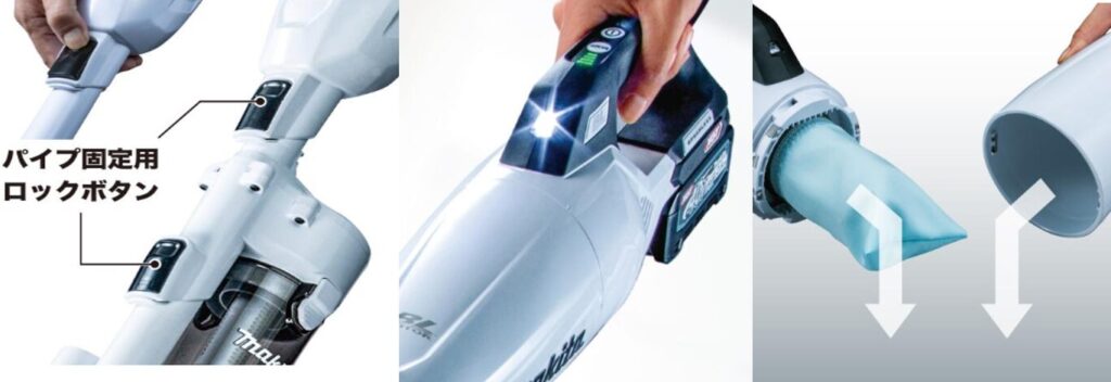 パイプ固定用ロックボタン     高輝度LEDライト付     ゴミ捨て簡単カプセル集じん