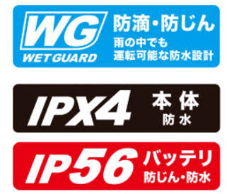 雨の中でも運転可能な防水設計、防滴・防じん「ウェットガード」&防水保護等級「IPX4」により実現。※雨の中での使用等に耐えうる製品仕様となっていますが、故障しないことを保証するものではありません(当社基準)。水や粉じんによって故障しないことを保証するものではありません。バッテリを装着した場合は、本体側の保護等級に準じます。