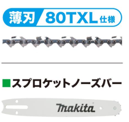 チェーン刃80TXL仕様。薄い刃幅で切断抵抗を大幅低減。鋭い喰いつきで快速切断。ゲージ厚1.1mm、ピッチ:0.325”。