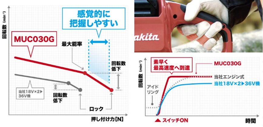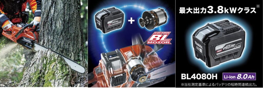 「MUC030G」+新バッテリ「BL4080H」の組み合わせにより、50㎤クラスのパワーを出すことができ、伐倒やせんてい作業を行う緑地管理業者・解体作業者、森林管理を行う林業労働者など、50㎤以上の大型チェーンソーを使用するユーザーにとっておすすめとなっています。
