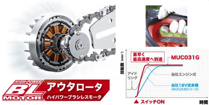 「MUC031G」はエンジン式27mlクラスと同等のパワーがあります。また高能率化・軽量化を実現しており、最適設計バランスとなっています。さらにトリガを引いてから最高速度まで約0.4秒とエンジンを上回る速さでトップスピードに達するため枝打ち作業などで優れた効果を発揮します。