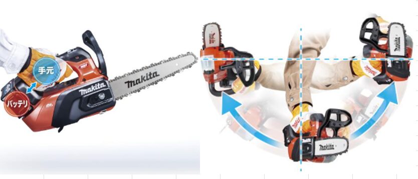 マキタ MUC031Gは充電式ながらチェーンスピード24.0m/s、エンジン式27.0㎤相当のハイパワーを誇ります。質量も3.0kgとエンジン式に比べ軽量となっており操作性に優れます。