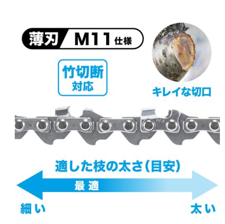 M11は刃先が小型で、アサリが小さく、切断溝が狭いため、ハンディーソーのようにチェーンスピードが遅いモデルではとくに跳ねが少なく感じます。果樹園などの作業においてファーストタッチでの良好な切削感を求めるユーザーにはM11がおすすめです