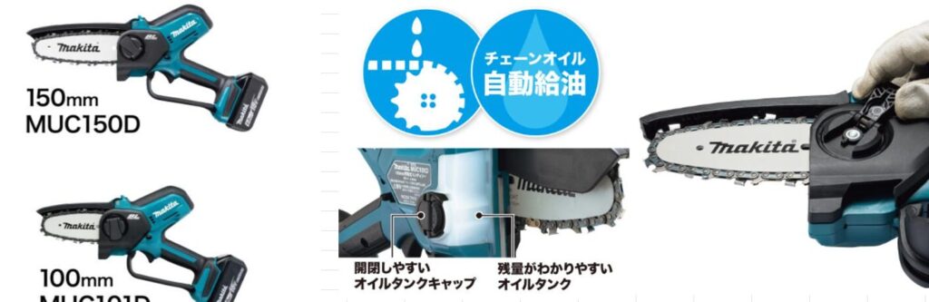 18Vハンディソーはガイドバーが100㎜と150㎜仕様があります。発売初期は100㎜仕様しかありませんでしたが、現在は150㎜仕様と併売となっています。本体は同じなため、大は小を兼ねるという意味では150㎜仕様の方がおすすめで、売れ行きもMUC150Dの150㎜タイプの方が圧倒的に売れています。