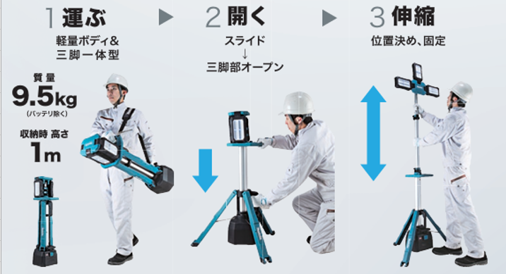 などの特徴があり、電源のない現場の照明や災害時の仮設照明に適したの機種となっています。