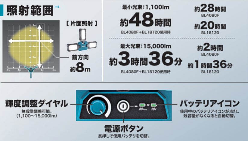 マキタ『ML014G』は光束1,100~15,000lmとML814に比べ約5倍の明るさとなっています。