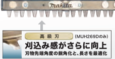 マキタ・MUH269Dは18V・BASICバッテリを使用しており、刃物長260㎜・ストローク数1,250・作業時間70分と効率を重視される方にはおすすめとなっています。また18Vかつ高級刃を使用しているため、刈込み感がさらに向上しており、切れ味を重視する方にもおすすめとなっています。