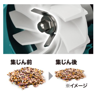 吸込んだ枯葉を細かく粉砕。吸込み後の枯葉体積を低減させることで、効率良く集じん。
