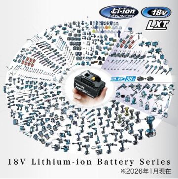インパクトドライバ、マルノコ、草刈機、チェンソー、運搬車、ファンジャケット、テレビ、保冷温庫、スマートフォン充電、クリーナ、ライトなど350モデル以上に共通使用可能。