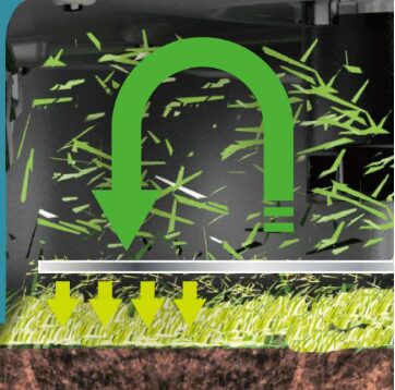 デッキ外周の一体壁構造が飛散物をシャットアウトし、デッキ底面の浮遊構造が芝刈効率を高めます。
