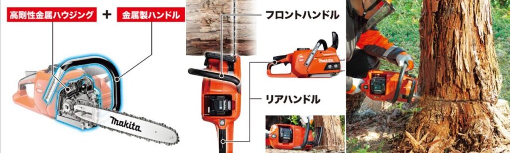 騒音を気にされる方(公園・緑地など市街地での伐倒作業を行う造園業者)、エンジン並みのパワーを求める方(解体業者、リフォーム業者など)には、特におすすめの機種となっています。