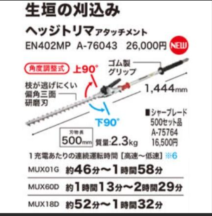 マキタのヘッジトリマアタッチメント「EN402MP」は、スプリットモータに装着してヘッジトリマとして使用できる角度調整式アタッチメントです。