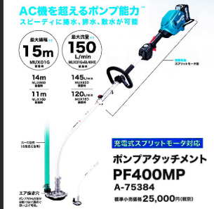 マキタ A-75384(PF400MP)ポンプアタッチメントは、スプリットモータで使用する高性能農業・土木用ポンプです。