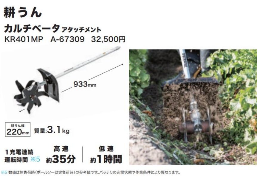 KR401MP(品番:A-67309)は、マキタのスプリットモータで使用可能なカルチベータ(耕うん機)アタッチメントです。