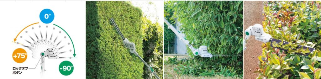 先端部の角度をUP/DOWNで12段階に細かく調整できます。生垣の側面刈込みから天面刈込み、下面刈込みや下草刈りまで、一台で幅広い作業をこなせます。