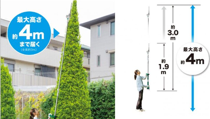 竿の最小長は約1.9m、最大長は約3.0mで、高い位置での作業では竿を最大に伸ばすことで最大約4mの高さまで届きます。
